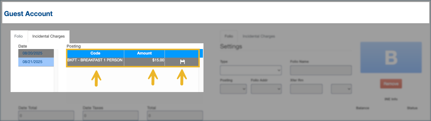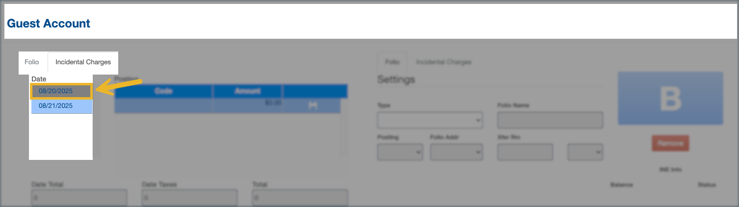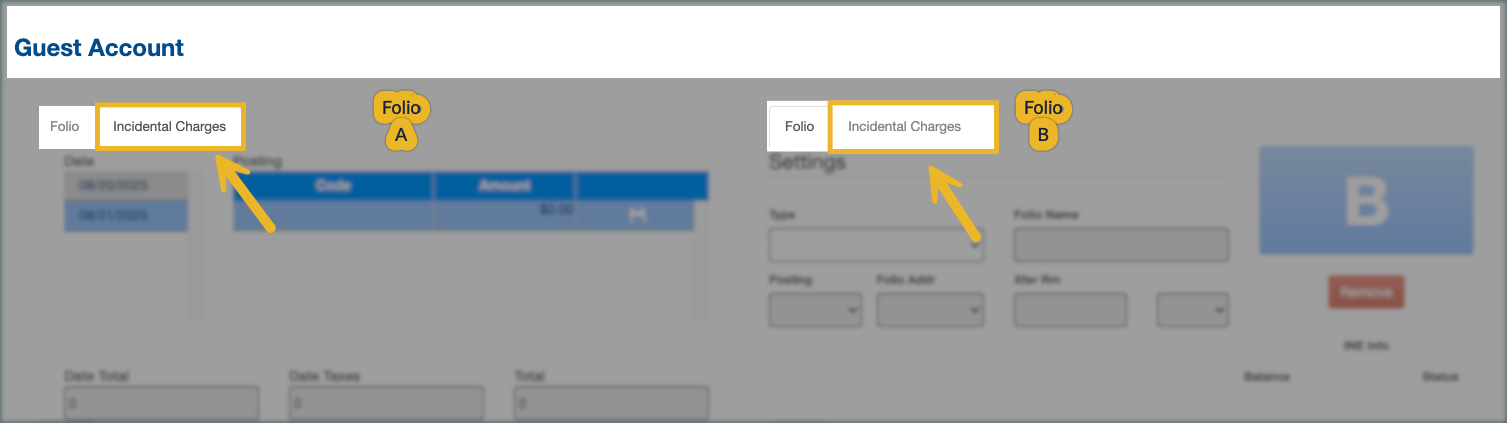 2. Choose the folio (A, B, C, or D) where the charges should be scheduled, then click the Incidental Charges tab.