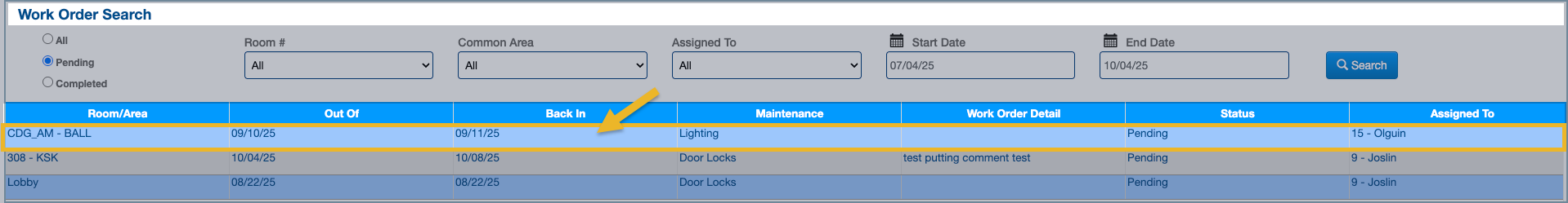 3. From the search results list, click a work order to open it and take further action (such as completing or reviewing details).