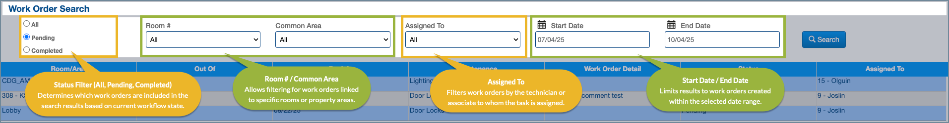 Use combined filters (e.g., status + date range) to narrow results quickly when there are many work orders.