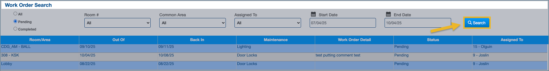 Locating an existing maintenance work order allows staff to view, update, or complete the request in Visual Matrix Cloud. Searching for work orders helps you find issues that are pending, in progress, or already completed, by filtering on criteria such as room number, common area, assigned associate, status, and date range. Knowing how to efficiently search for work orders supports timely resolution and keeps maintenance workflows organized.