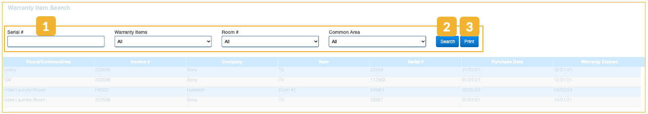 1. Use any necessary filter to find a specific warranty. Search by Serial Number, Warranty Item, Room# or Common Area the item is in.
