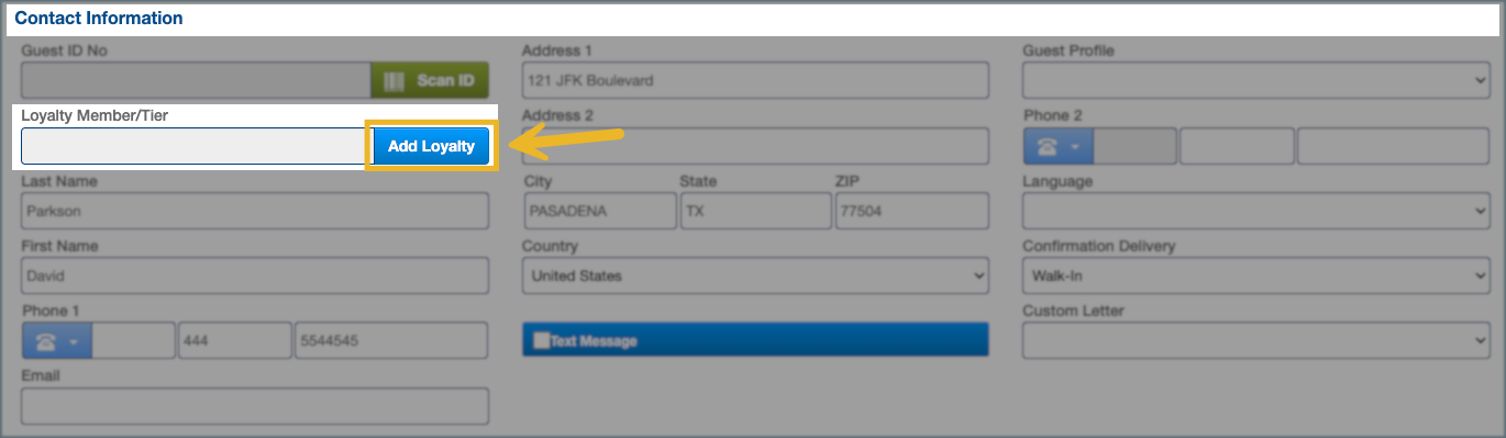1. Open the reservation. The Add Loyalty button appears only if the reservation has been saved.