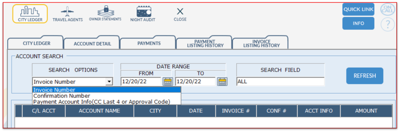 - by invoice number, folio confirmation number or payment account info (CC last 4 or approval code).
