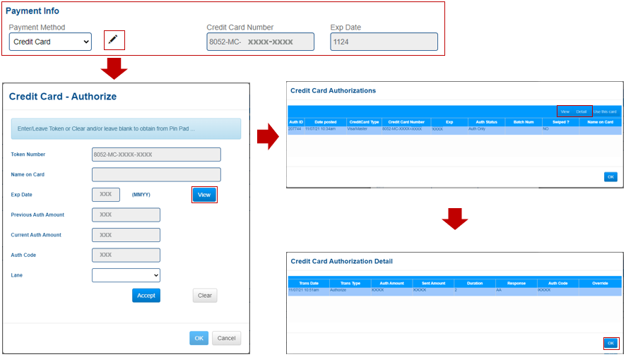 - Click on View: This window will display all the credit cards that were entered, tapped, swiped, or chipped for that reservation;