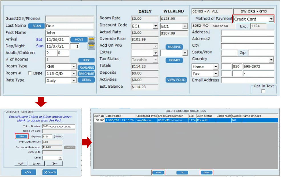 - Click on View: This window will display all the credit cards that were entered, tapped, swiped, or chipped for that reservation;