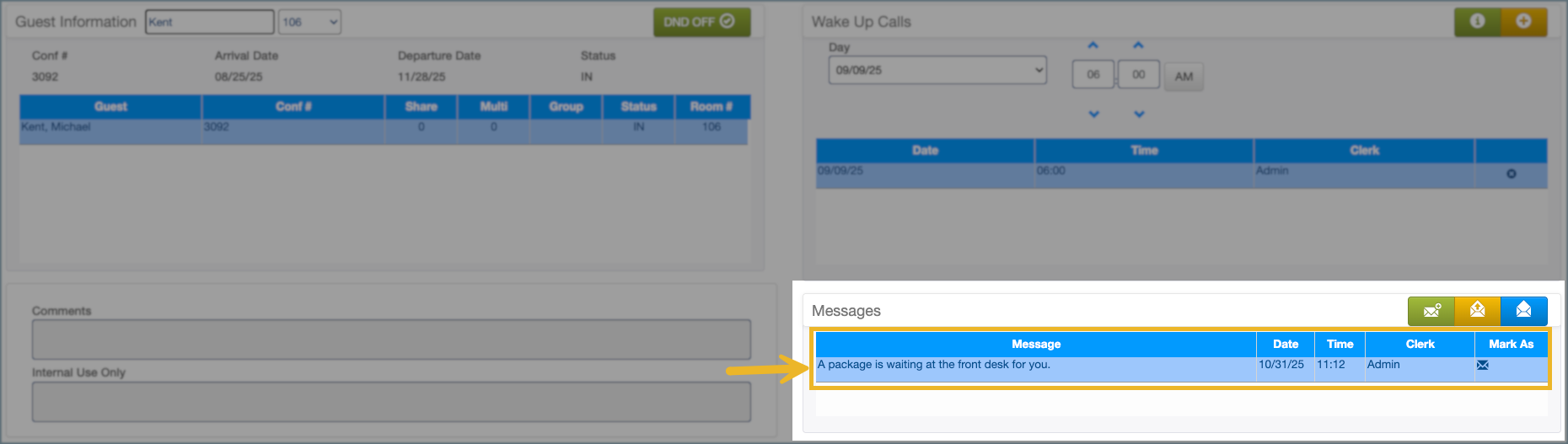 4. After sending, the message will appear in the list as Pending. The guest’s room phone light will flash to signal a message is waiting.