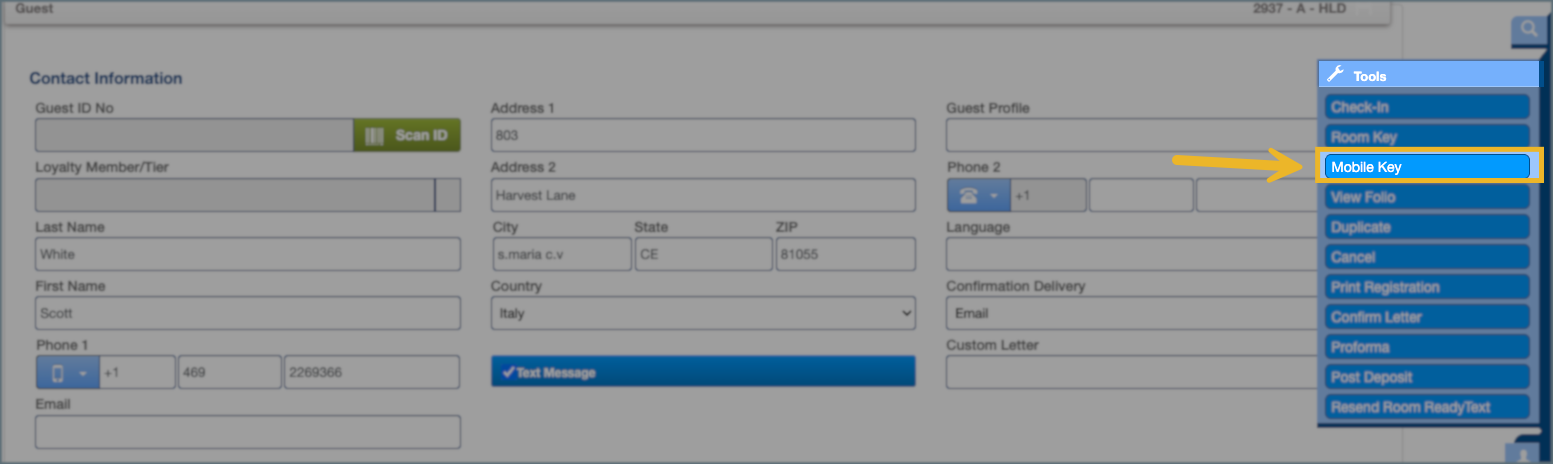 1. After opening the reservation, click Mobile Key in the Toolbox. A pop-up window appears asking where to send the mobile key at check-in time.