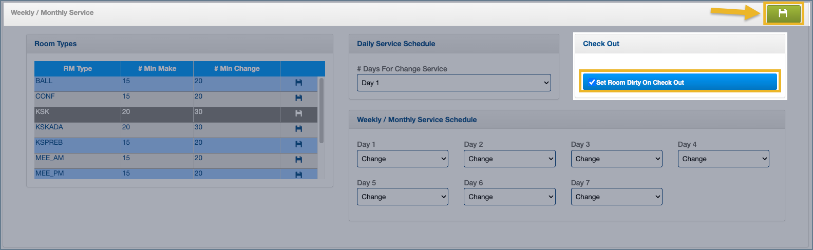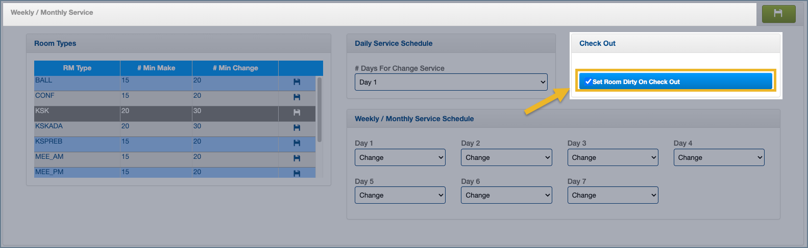 1. In the Check Out section, check the box labeled Set Room Dirty on Check Out.
