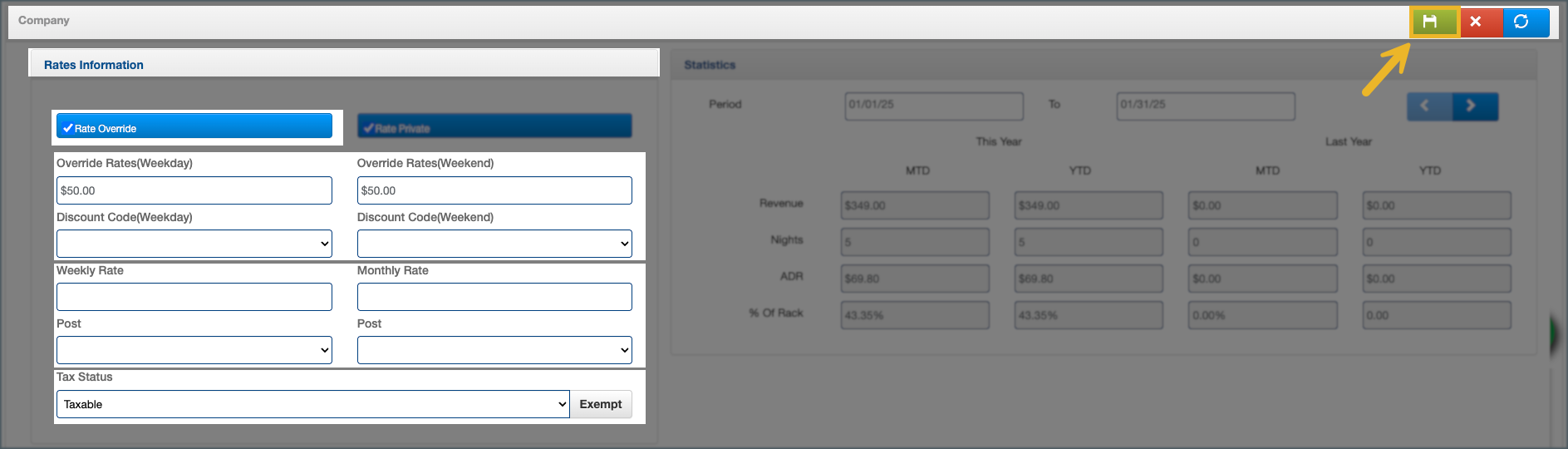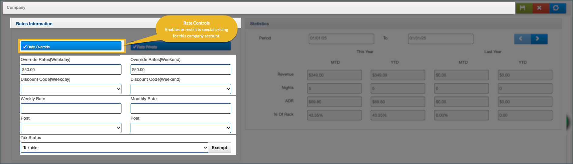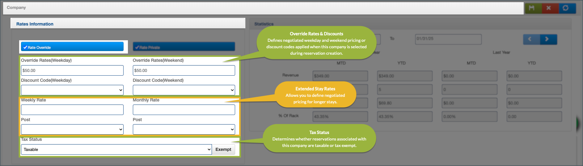 - Weekly or Monthly Override Rate: Used when the company agreement includes extended stay pricing, such as weekly or monthly negotiated rates.