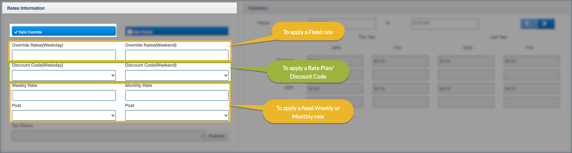 Only one type of override can be used per company profile. You must choose either a fixed daily/weekly/monthly override rate or apply a rate plan/discount code. It is not possible to configure both at the same time.