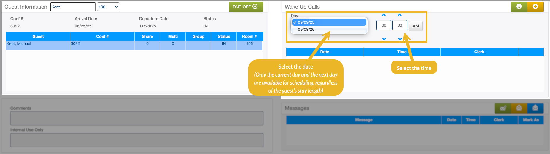 2. On the wake-up call tab, choose the day (typically today or tomorrow) and set the time for the call.