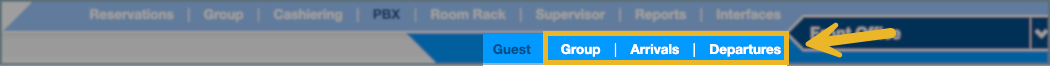 Use the Group, Arrival, or Departure sub-sections only to search for guests. After selecting one, the system automatically returns to the Guest tab.