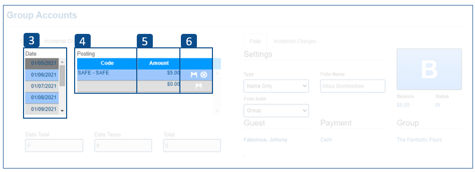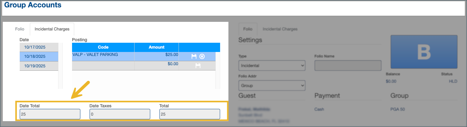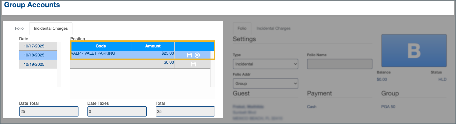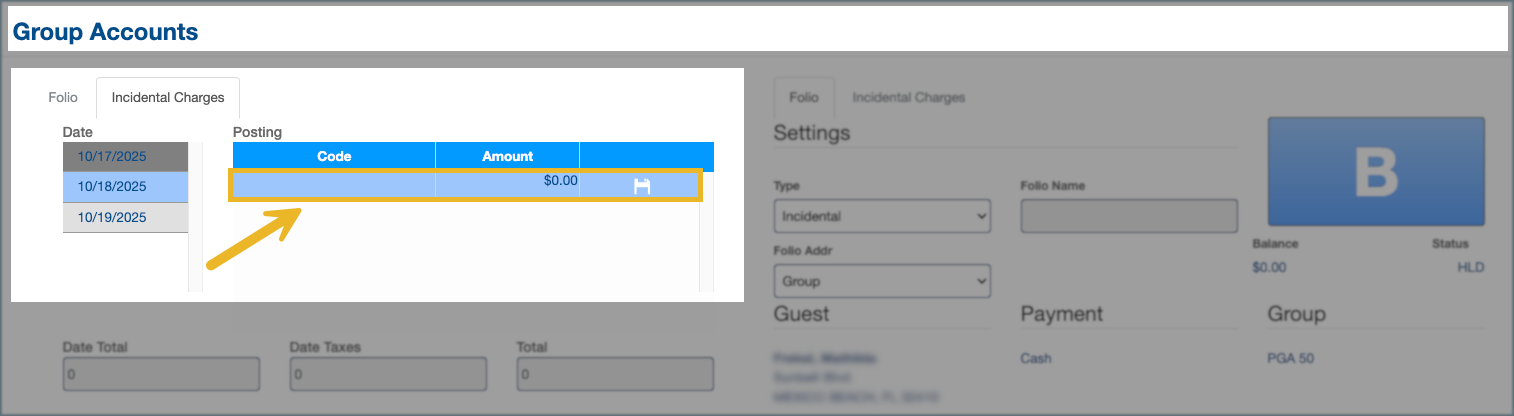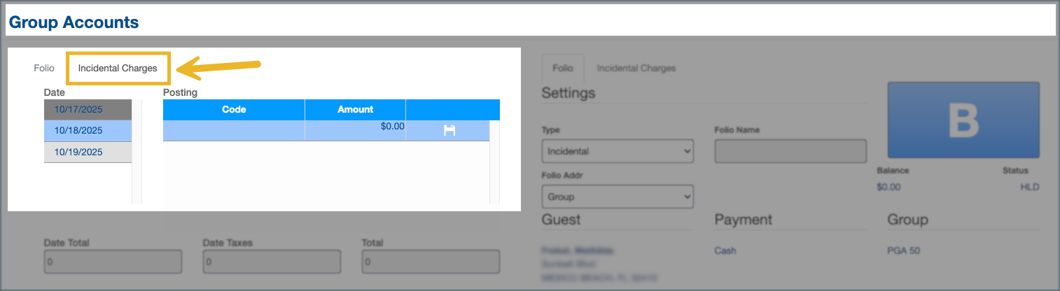 2. Go to the Incidental Charges tab (or Schedule Charges, depending on your setup) of the folio where the charge should be posted.