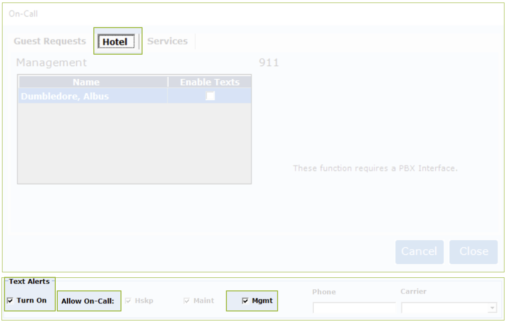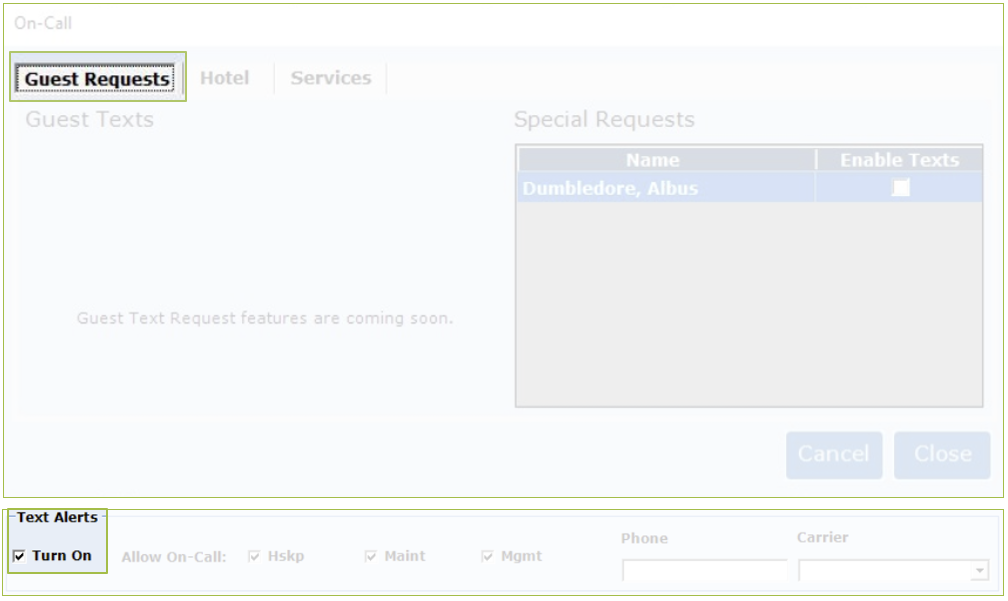 - Special Requests: will show any user that has the Text Alerts Turn On checked in their profile (Management > Admin > Security). Those are the Special Requests made in the reservation. When a Special Request is made, an internal message can be sent to whoever is checked. If this user has a phone number, it will send by text instead of internal messaging
