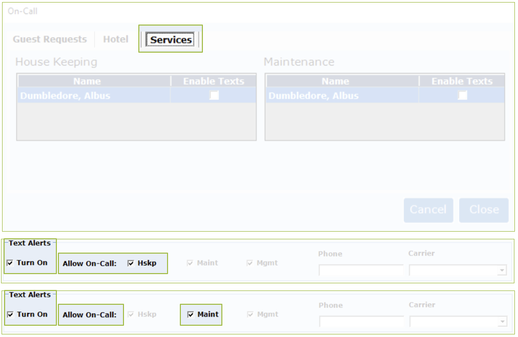 - Maintenance: will show in the list only the users that have Text Alerts Turn On checked in their profile (Management > Admin > Security) and have the Maint text box checked. Once checked, if that user has a phone number set up, the user will receive every Housekeeping notification through Twilio (more reliable for the cost of the text), otherwise, messages will be through internal messaging.