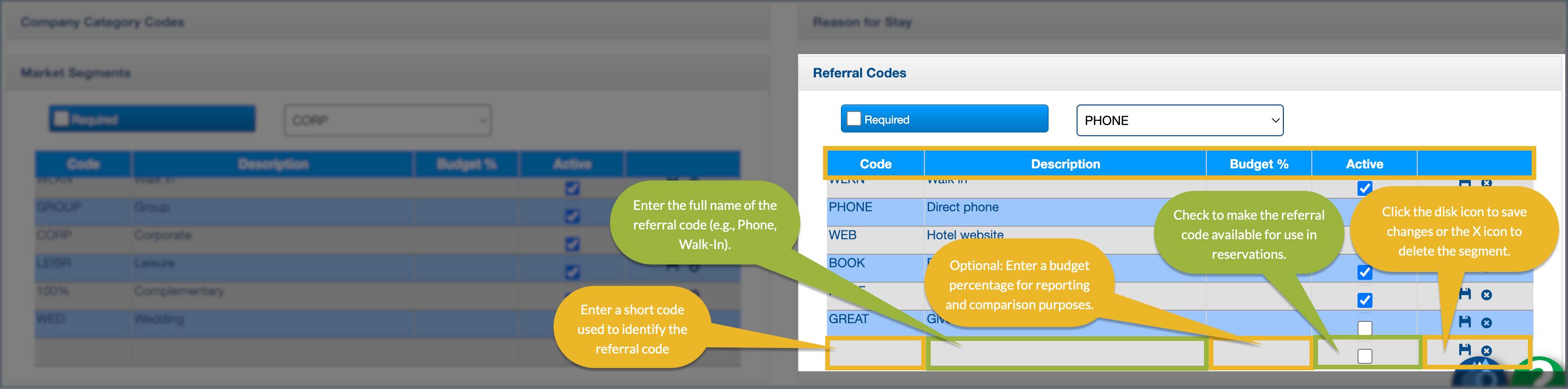 The Referral Codes setup allows you to create and manage the booking sources used in reservations.