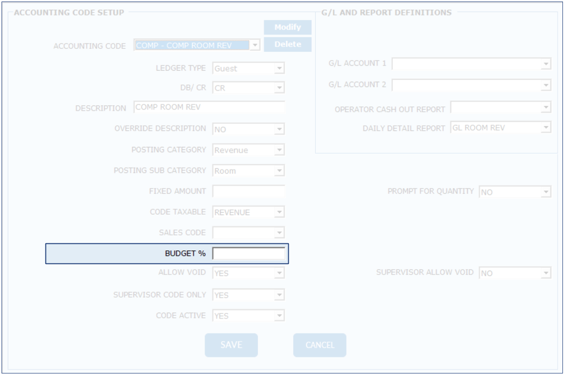 11. If applicable and used, enter a budget percentage. This percentage will be compared to budgetary numbers. It will also allow you to take last year's figures and offset them by this budgetary percentage to reflect on a report as a comparative number.