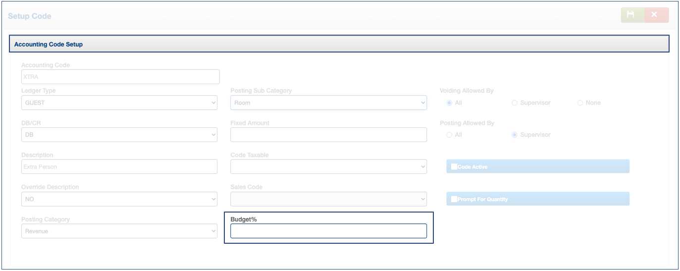 11. If applicable and used, enter a budget percentage. This percentage will be compared to budgetary numbers. It will also allow you to take last year's figures and offset them by this budgetary percentage to reflect on a report as a comparative number.