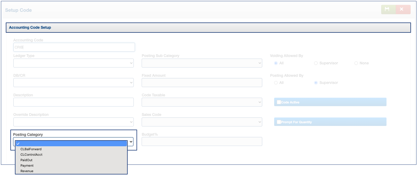 7. Select the posting category from the dropdown. There are 5 options: Adv Dep Xfer, Guest Ledger Balance, Payment, Revenue and Paid Out. Only Payment or Revenue should be Categories to used.