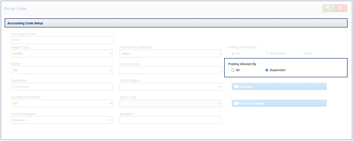 - Select Supervisor to make the accounting code available only to users that have supervisor privileges.