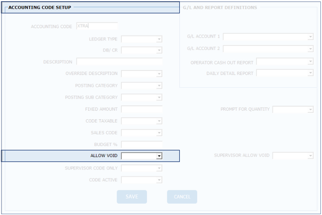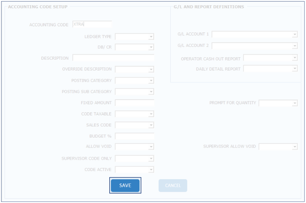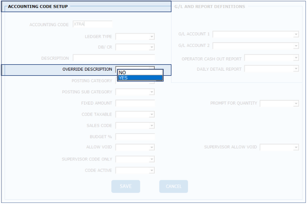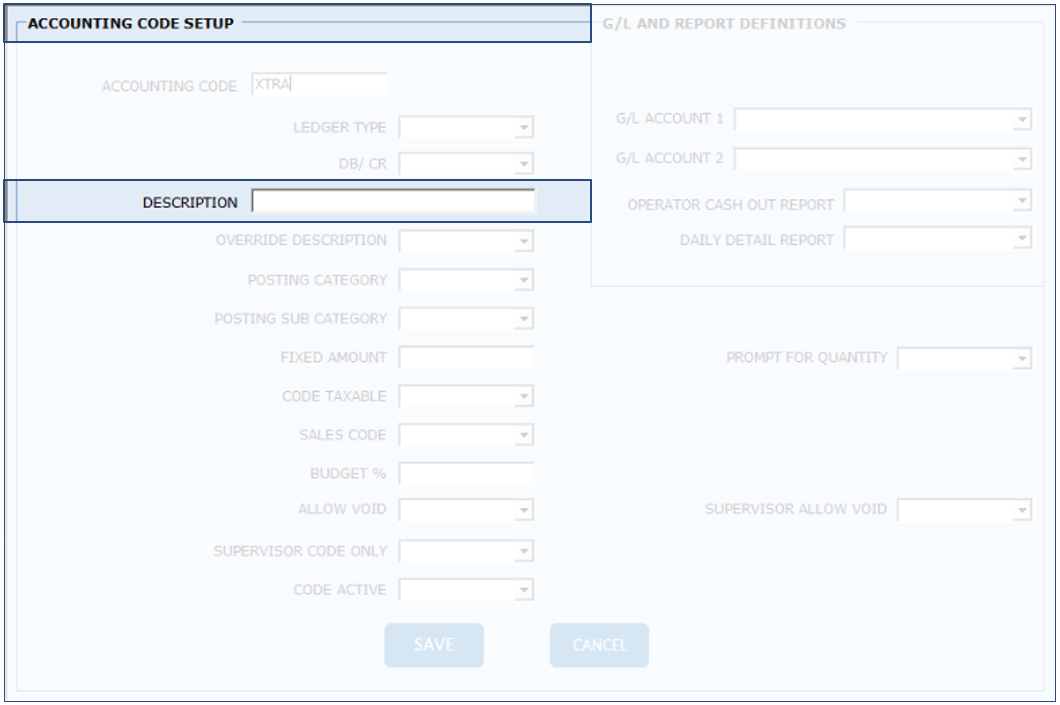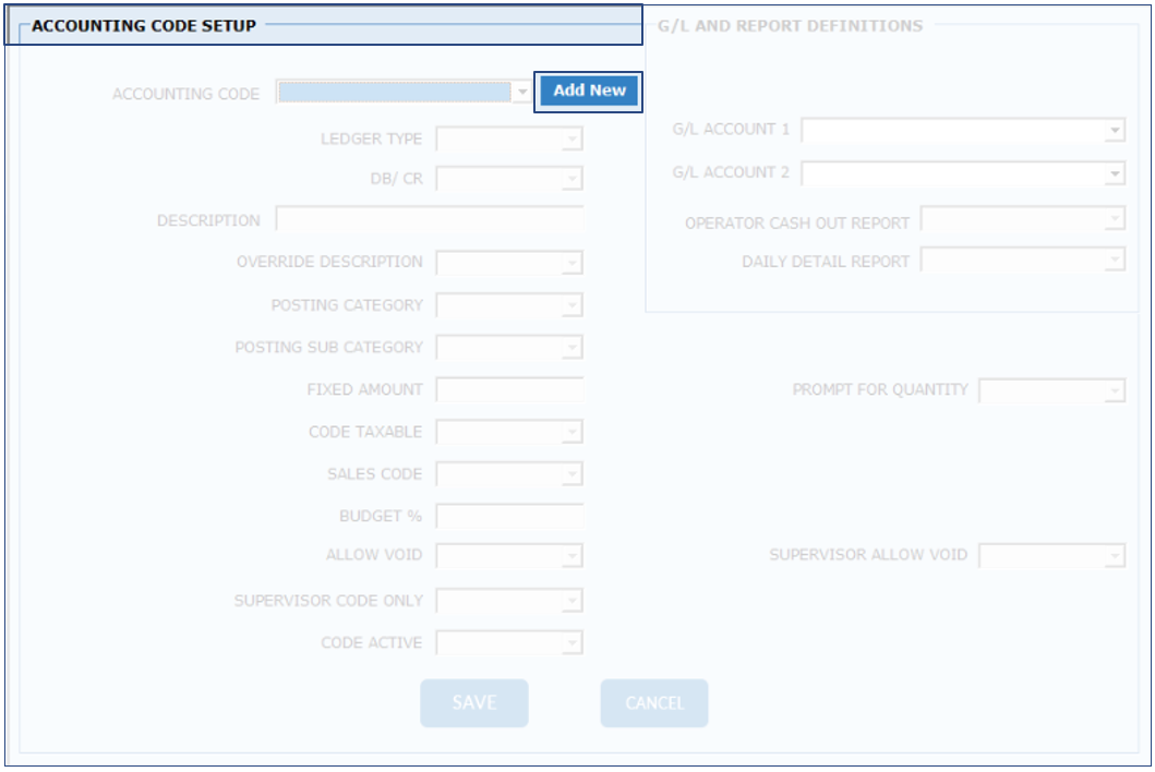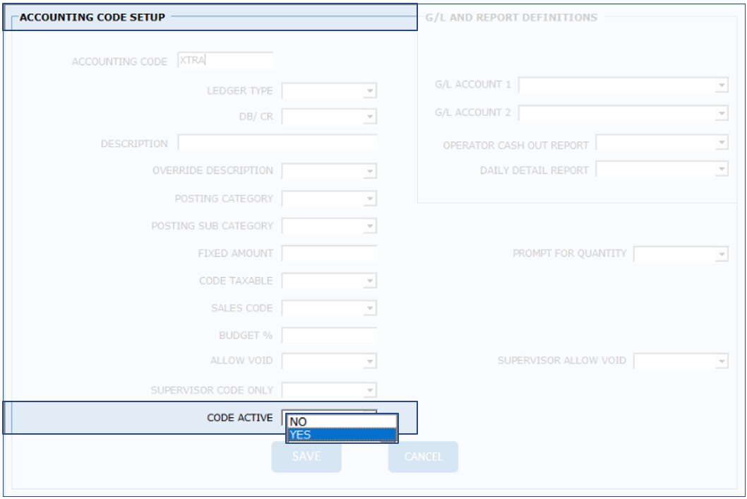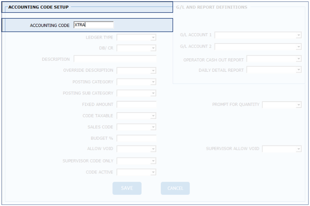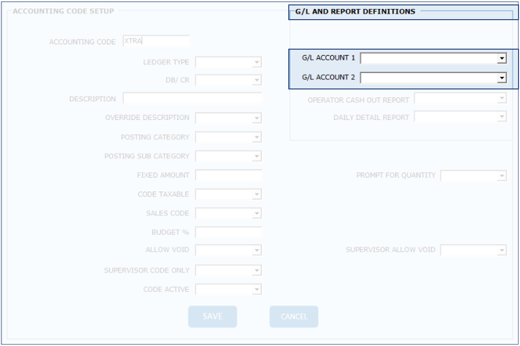 Second section in an accounting code creation is to setup the G/L and report definition.