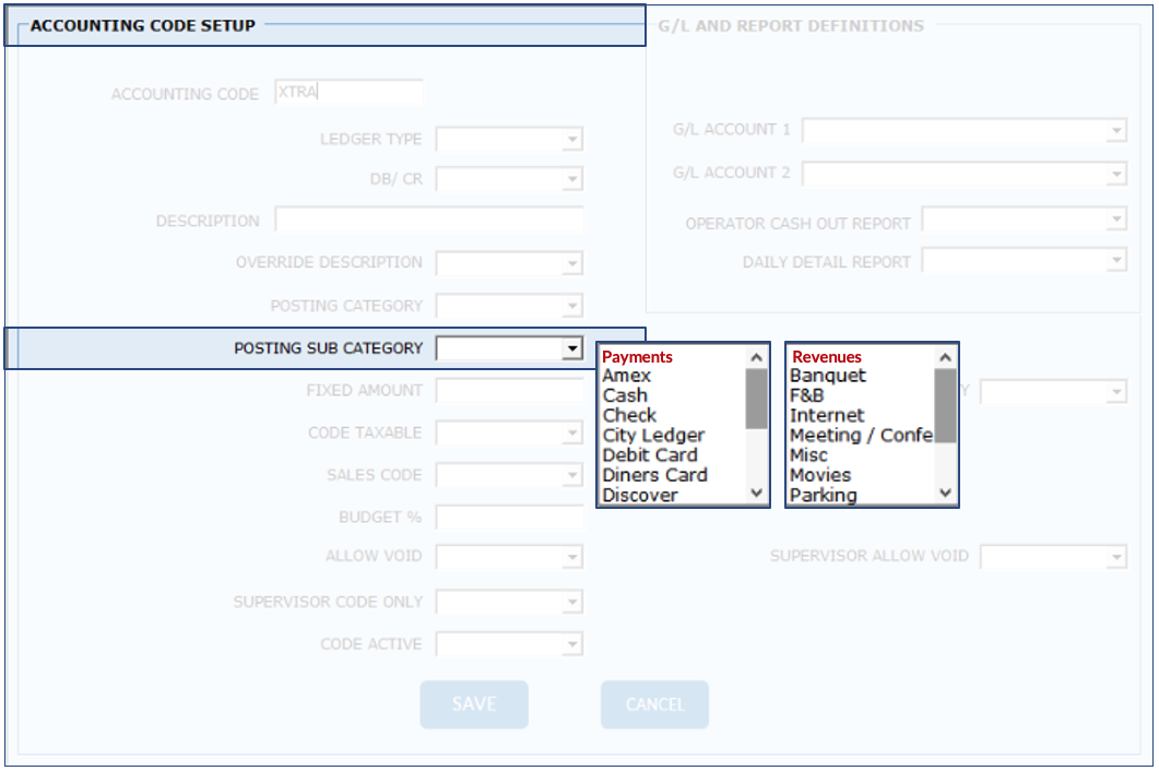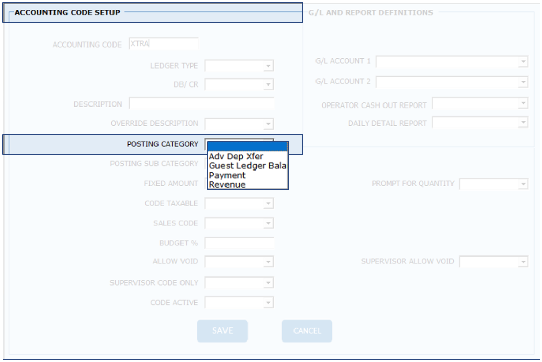 7. Select the posting category from the dropdown. There are 4 options: Adv Dep Xfer, Guest Ledger Balance, Payment, and Revenue. Only Payment or Revenue should be Categories used. Adv Dep Xfer and Guest Ledger Balance are used by Visual Matrix for transfer balances between City Ledger and Guest Ledger.