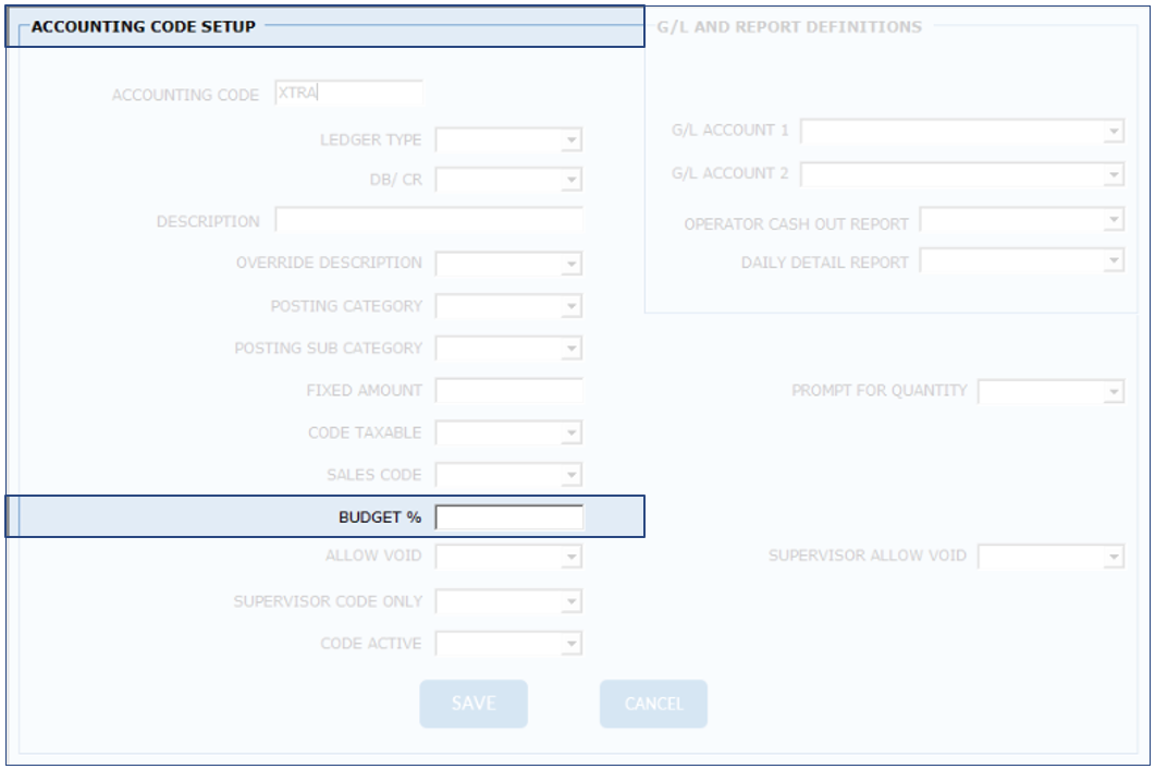 11. If applicable and used, enter a budget percentage. This percentage will be compared to budgetary numbers. It will also allow you to take last year's figures and offset them with this budgetary percentage to reflect on a report as a comparative number.