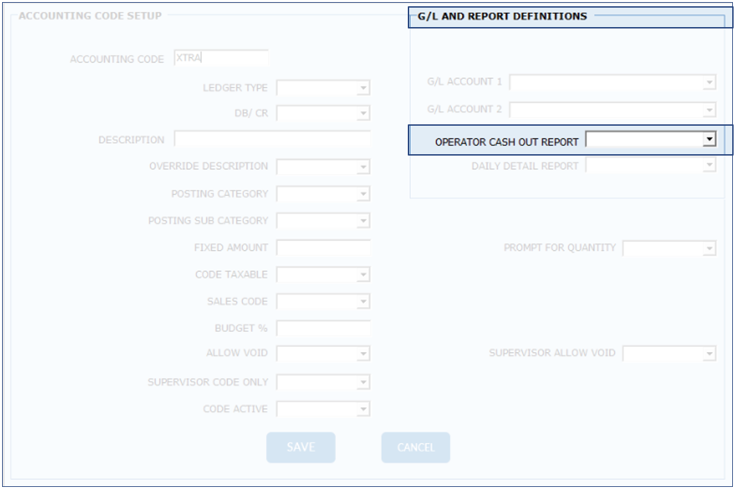 which heading transactions made with this accounting code will fall under on the Operator Cash Out Report.
