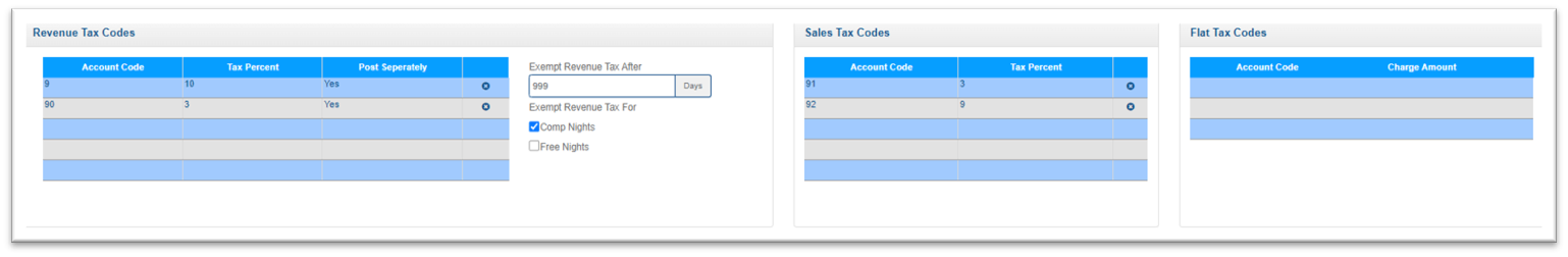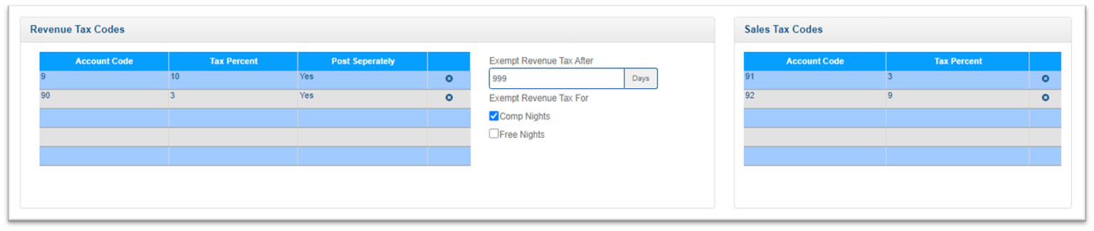 In the provided example, code 90 designates the State tax for the revenue tax package, while code 91 signifies the State tax for sales, which will be applied to the additional "Hotel Stay Tax."