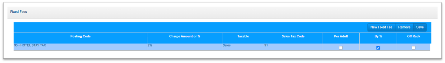 6. Configure the hotel stay tax by specifying whether it will be a fixed amount or a percentage, and indicate whether it will apply to the posted room revenue or the room revenue off rack.