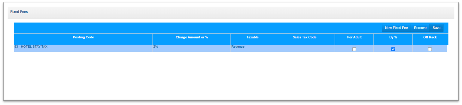 3. Configure the hotel stay tax by specifying whether it will be a fixed amount or a percentage, and indicate whether it will apply to the posted room revenue or the room revenue off rack.