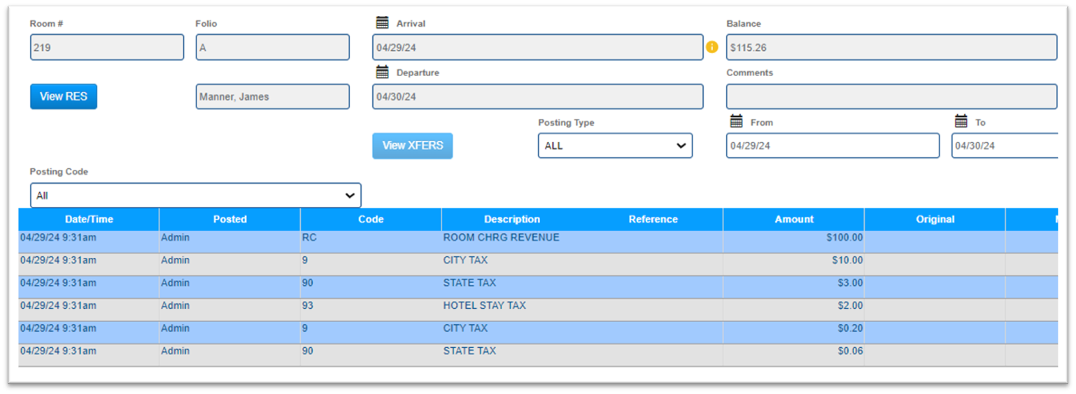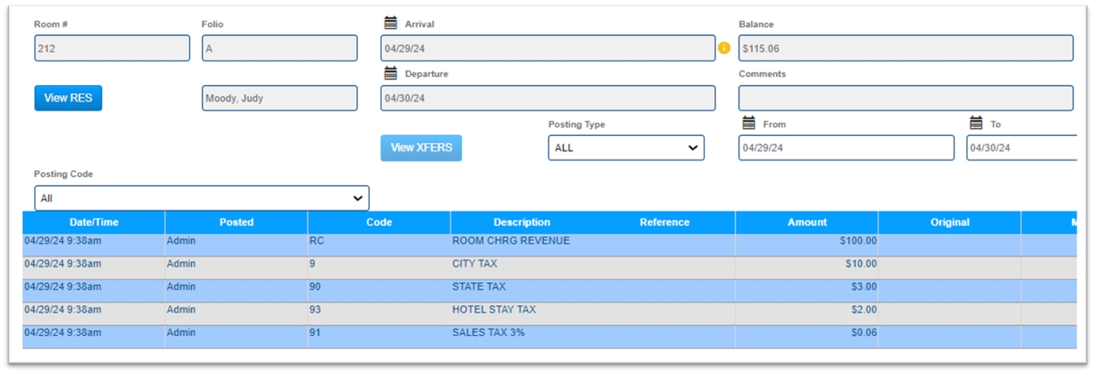 5. This will automatically apply all Revenue Taxes to this fee when the audit posts the Room and Tax, as illustrated below.