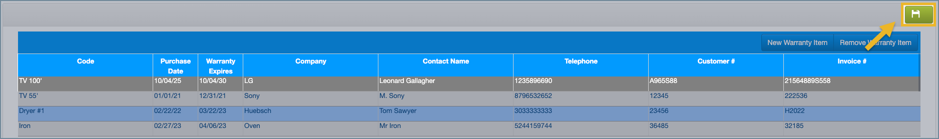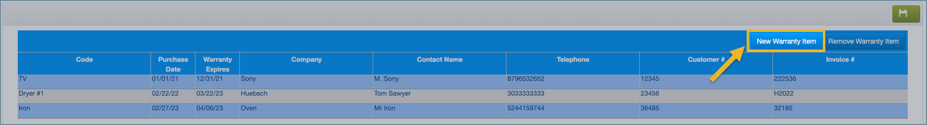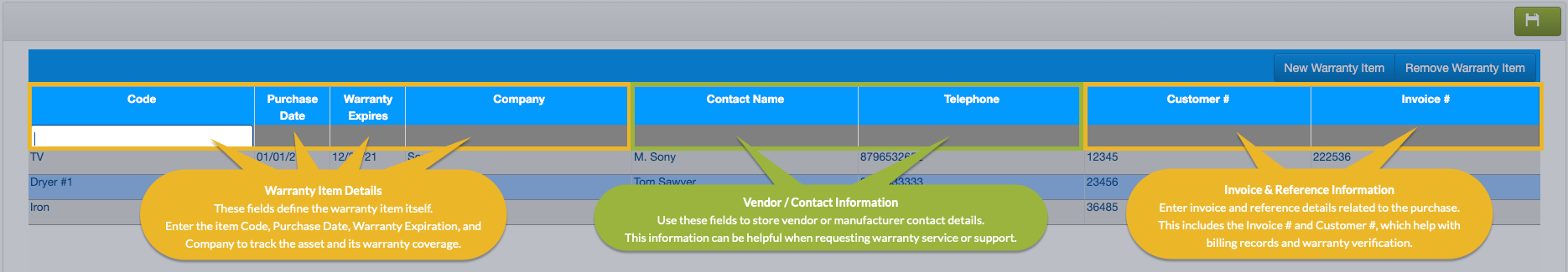 2. Enter the warranty item details, including: Code (item name), Purchase Date, Warranty Expires, Company, Contact Name, Telephone, Customer #, Invoice #.