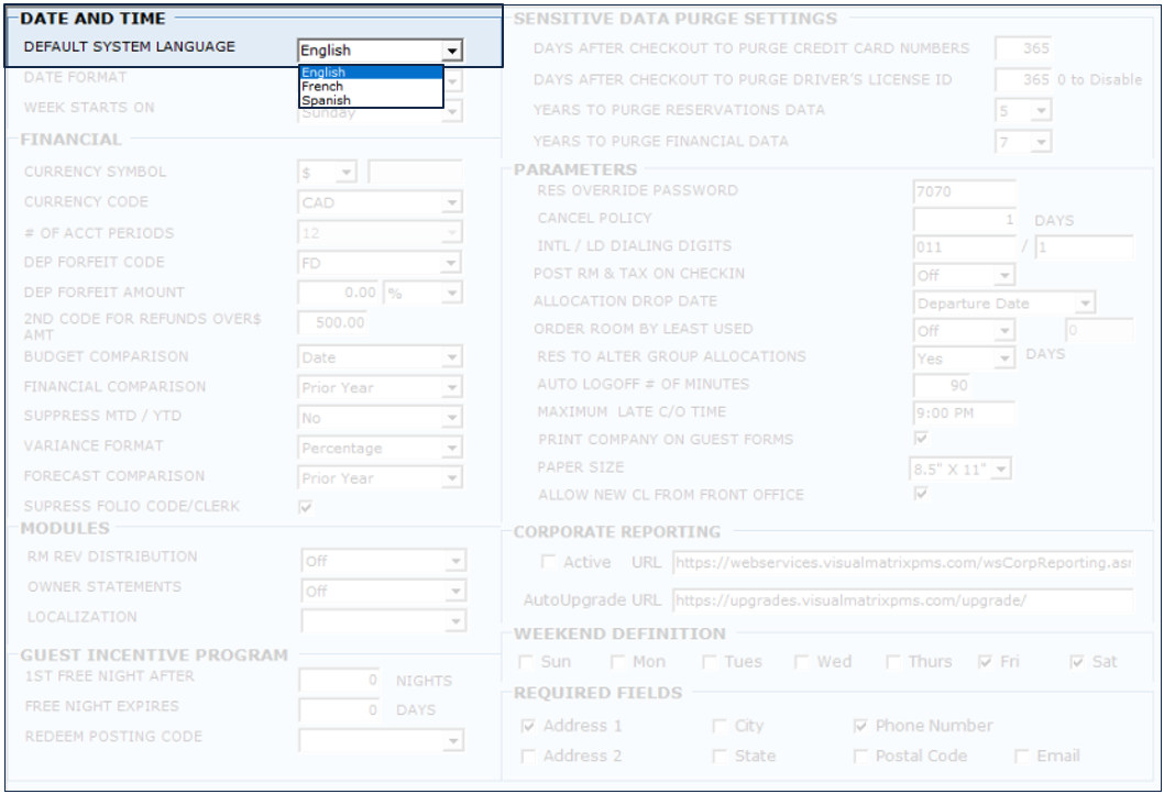 Path: Management > Setup > Property > Parameters > Section "Date And Time" (top left)