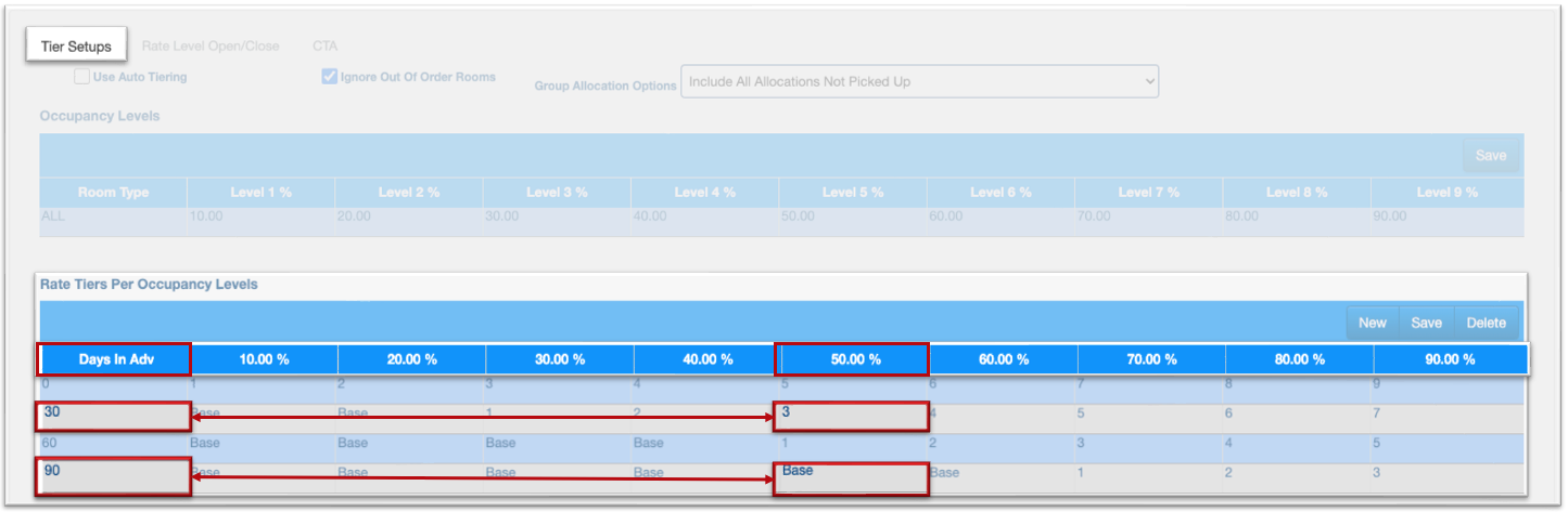 This means you can configure the PMS to trigger a Base rate at Level 5/50% for any bookings made up to 90 days in advance, while also setting the same Level 5/50% to trigger a Tier3 rate for bookings made up to 30 days in advance.