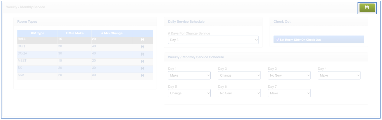 ? Watch Video The Weekly/Monthly Service Schedule allows you to set a 7-day service plan for reservations with Weekly or Monthly rate types. For each day, you can select one of three options: Change, Make, or No Service. This schedule applies only ...