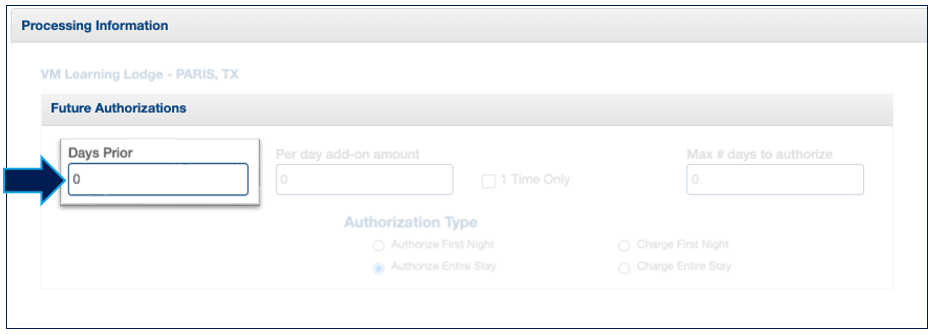 Setting the "Days Prior" parameter with "1" means that during the audit, every card for the next day's arrivals will be authorized for the entire stay or first night, depending on the specified setting. It's important to note that these authorizations will be considered as manual and won't offer chargeback protection. While some processors may charge more for manual authorizations, Visual Matrix does not perform this action.