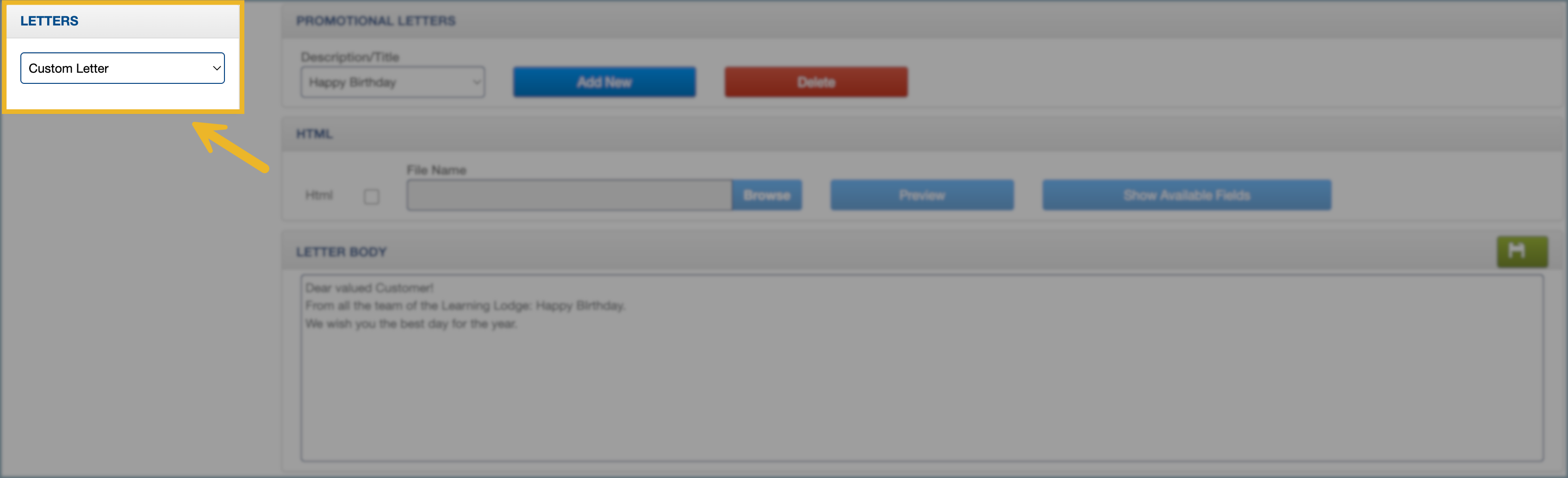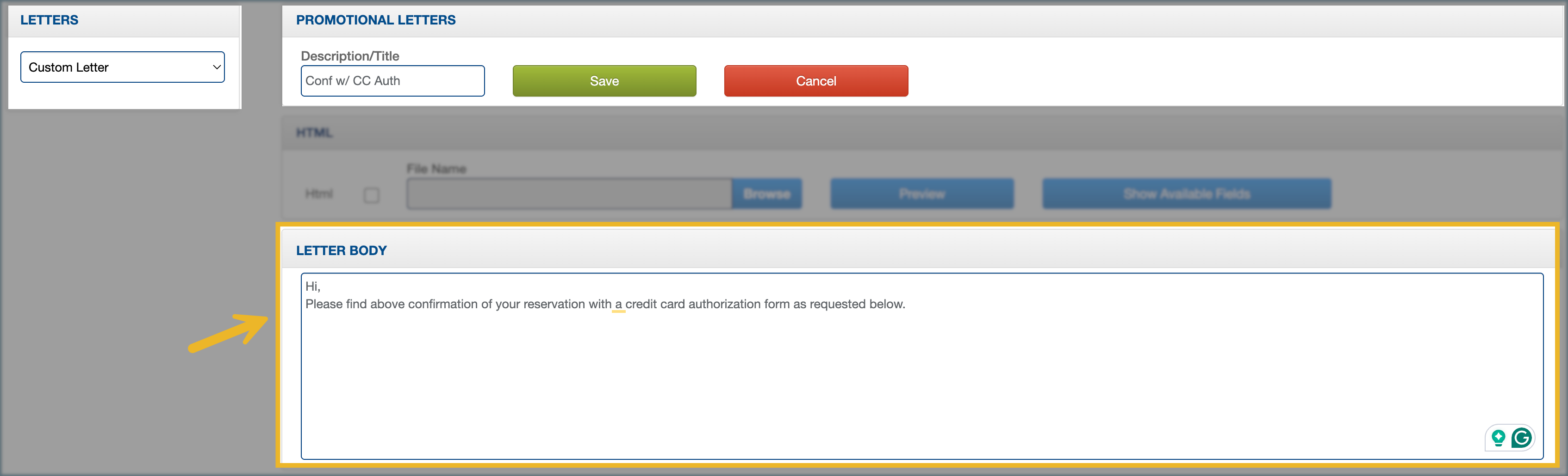 5/8. Click Save to create the custom letter. Changes are not saved from the text box or HTML section until this button is selected.