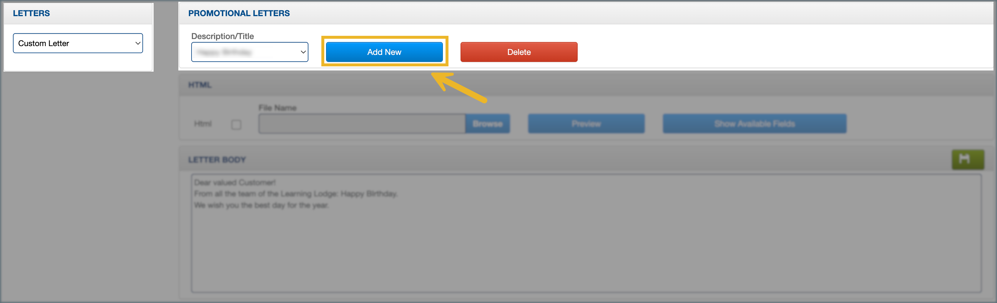 The header may display “Promotional Letters,” but the left panel determines the active section.