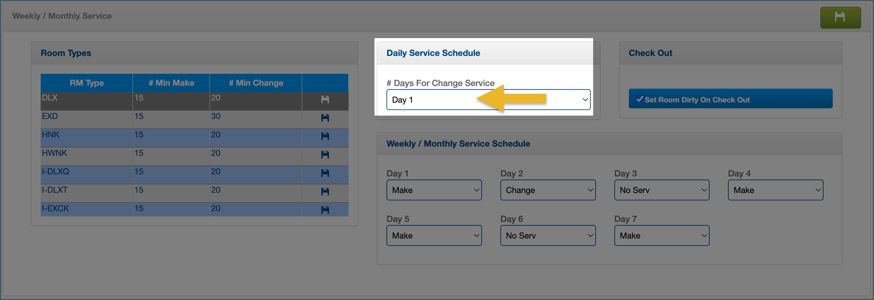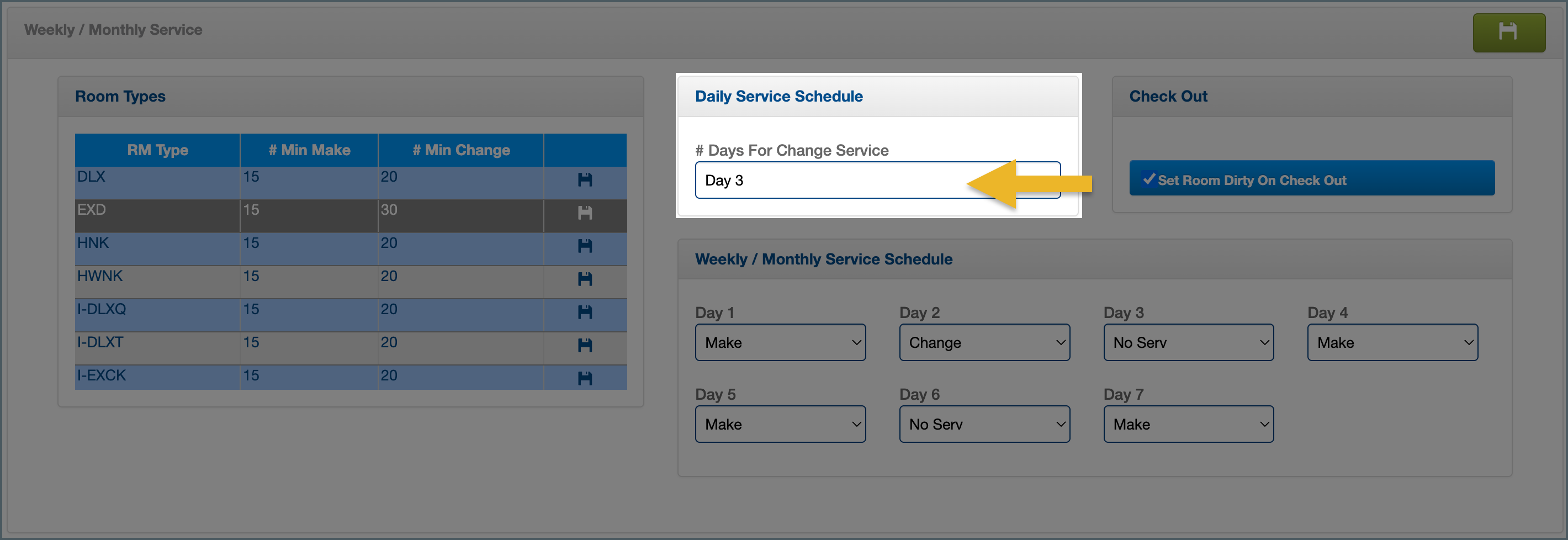 ? Watch Video The Weekly/Monthly Service Schedule allows you to set a 7-day service plan for reservations with Weekly or Monthly rate types. For each day, you can select one of three options: Change, Make, or No Service. This schedule applies only ...
