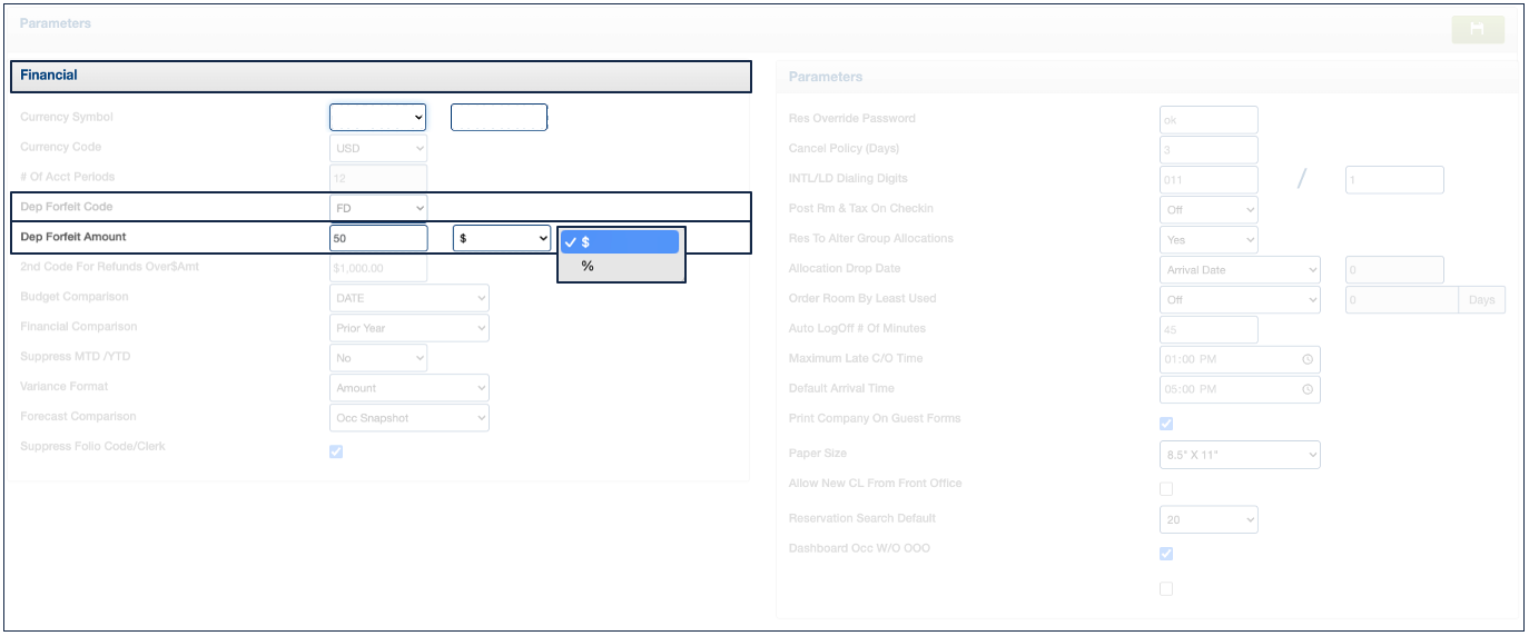 2. Choose to set up the deposit forfeit amount as a percentage (%) or as a dollar amount ($), and enter the amount or percentage.