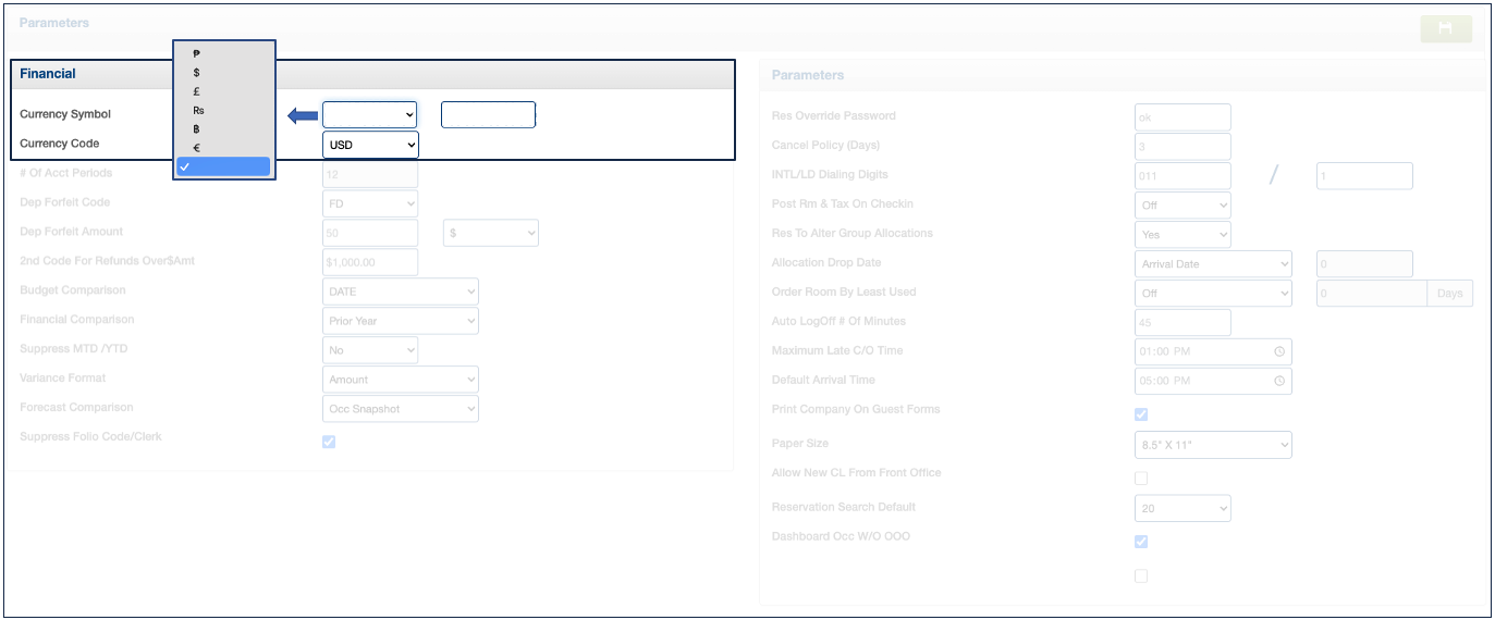 Path: Management > Property Settings > Parameters > Section "Financial" (left side)