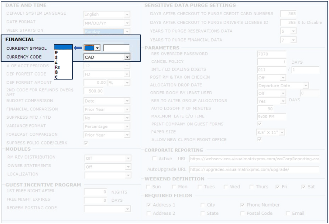 Path: Management > Setup > Property > Parameters > Section "Financial" (left side)