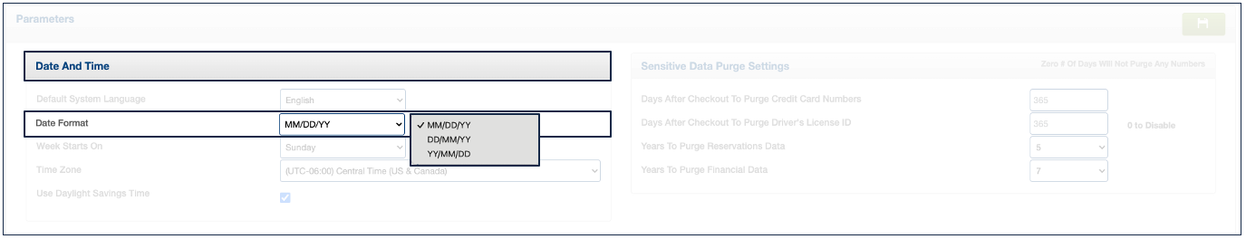 Path: Management > Property Settings > Parameters > Section "Date And Time" (top left)