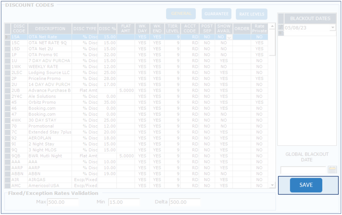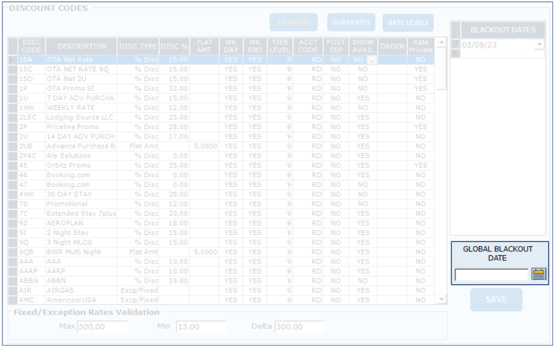 This setup applies to all rates settings and Excp/Fixed Discount Codes. If a rate is entered higher than the Max, lower than the Min, or the difference is higher than the Delta, a warning will show. It will not prevent the modification, only warn ...