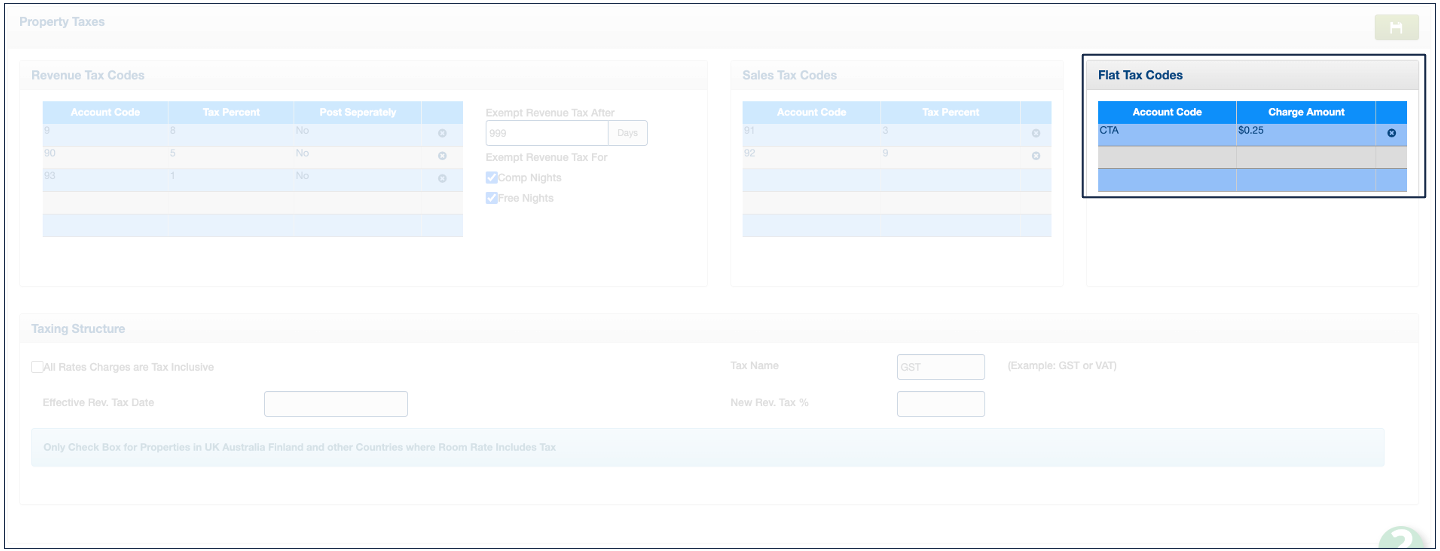 This area is intended for configuring Flat Tax(es). Flat taxes are occupancy-based taxes that are automatically posted during the night audit. They are established by a fixed amount rather than a percentage. Similar to the revenue tax, flat taxes can also be exempted.