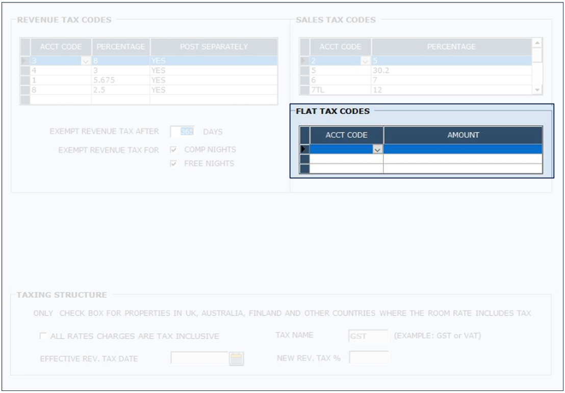 This section is to setup Flat Tax(es). Flat tax(es) are taxes that are applicable by occupancy and is posted automatically with the night audit posting. It is setup by amount and not by percentage. Flat tax can be exempted like the revenue tax.