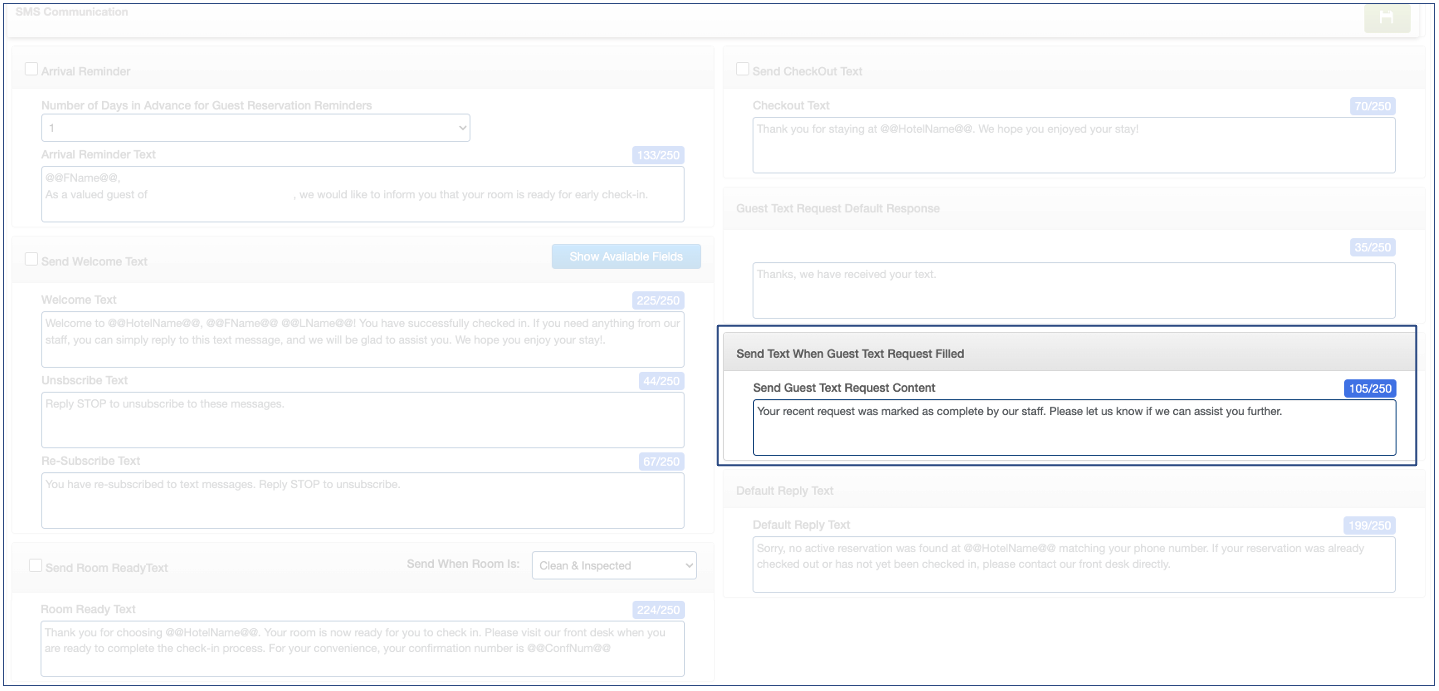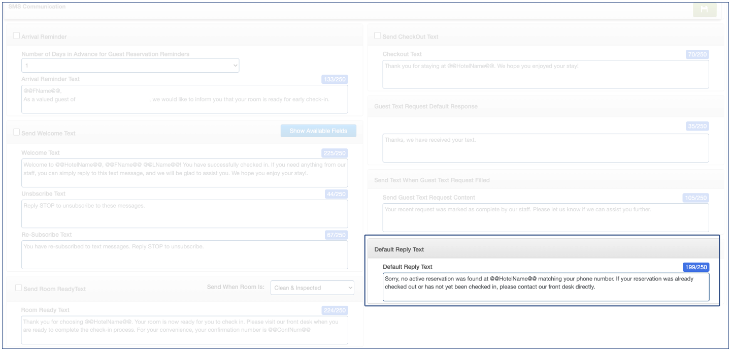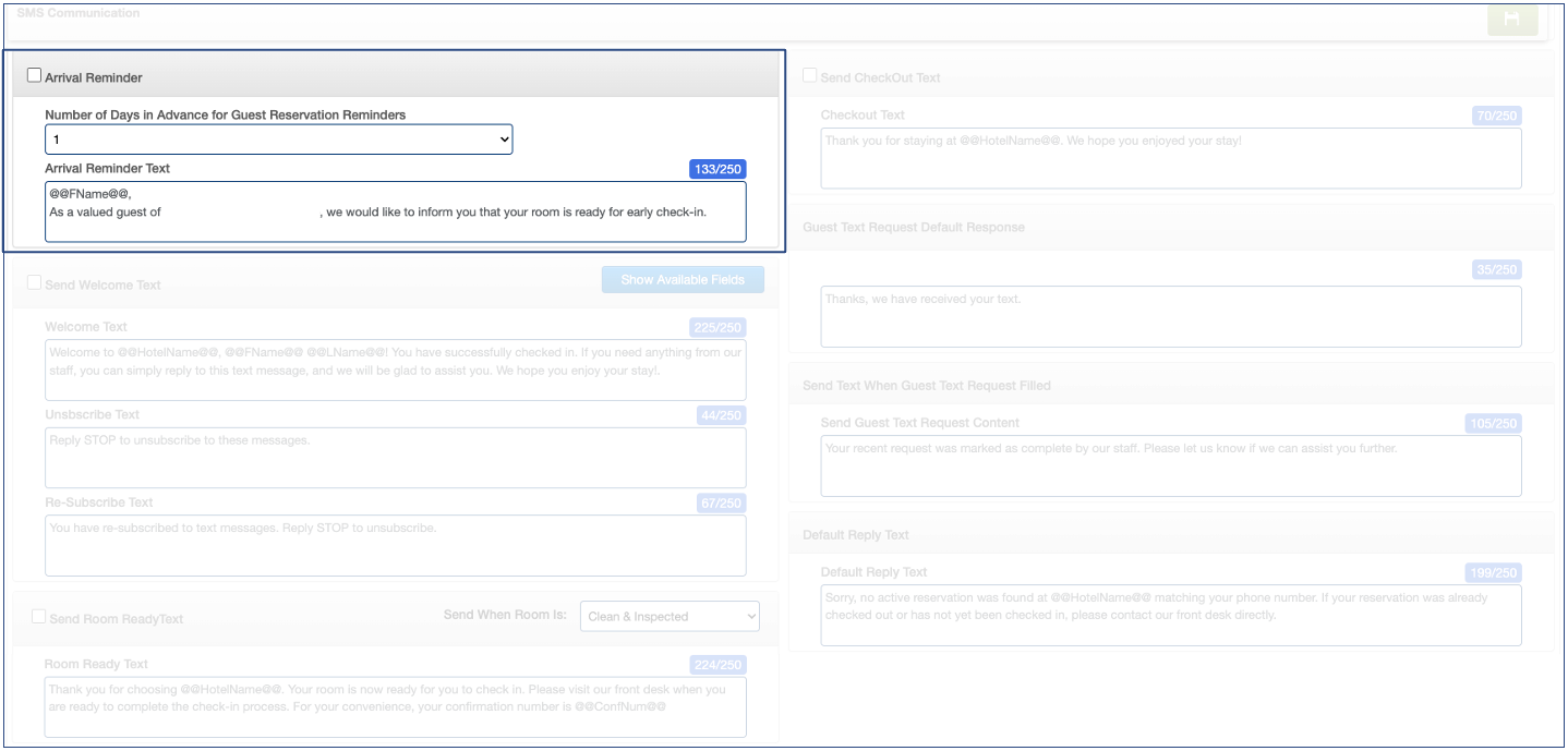 Every following messages are only send if the guest is opted-in the guest texting option in their reservation. Messages can have up to 250 characters and can include any of the 6 dynamic codes available: Guest First Name, Guest Last Name, Reservation Confirmation Number, Room Number Assigned, Hotel Name and/or Guest Arrival Date.