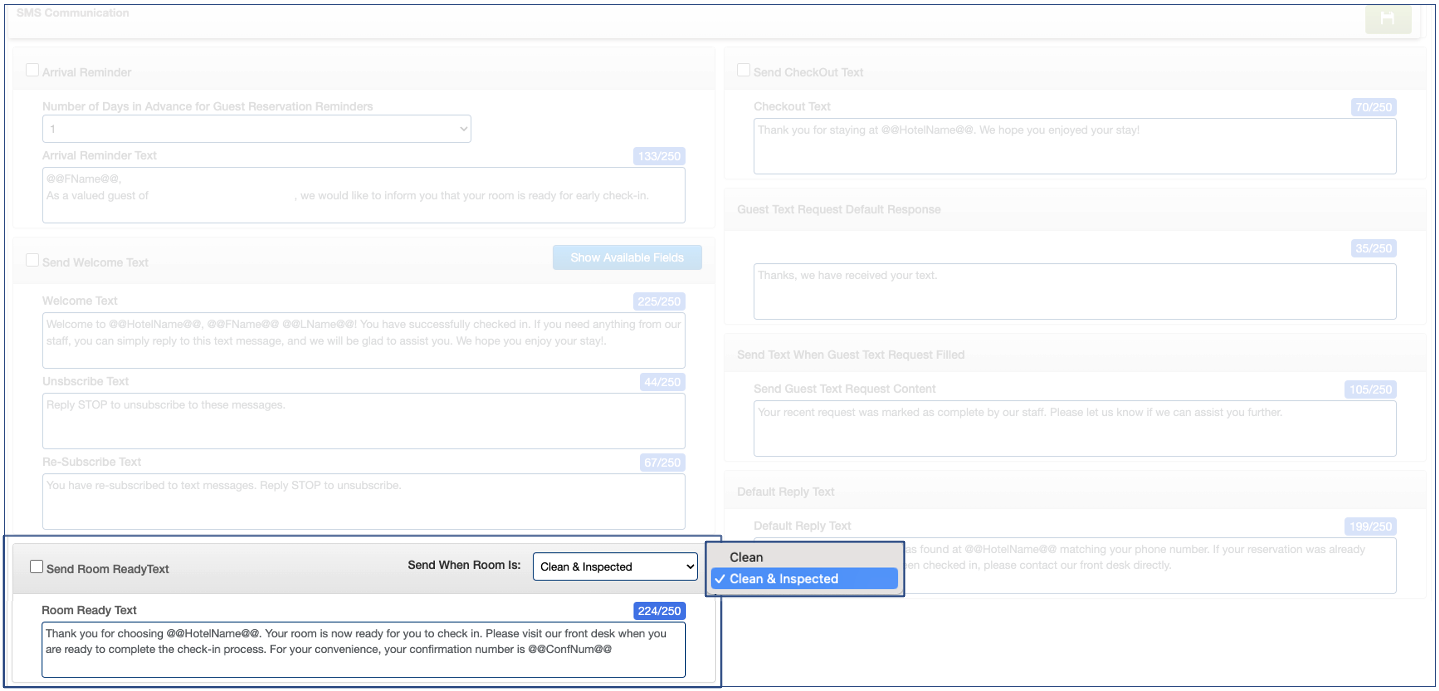 7. Room Ready: this text will send as soon as the allocated room condition changes to "Clean" or "Clean & Inspected" - select from the dropdown.
