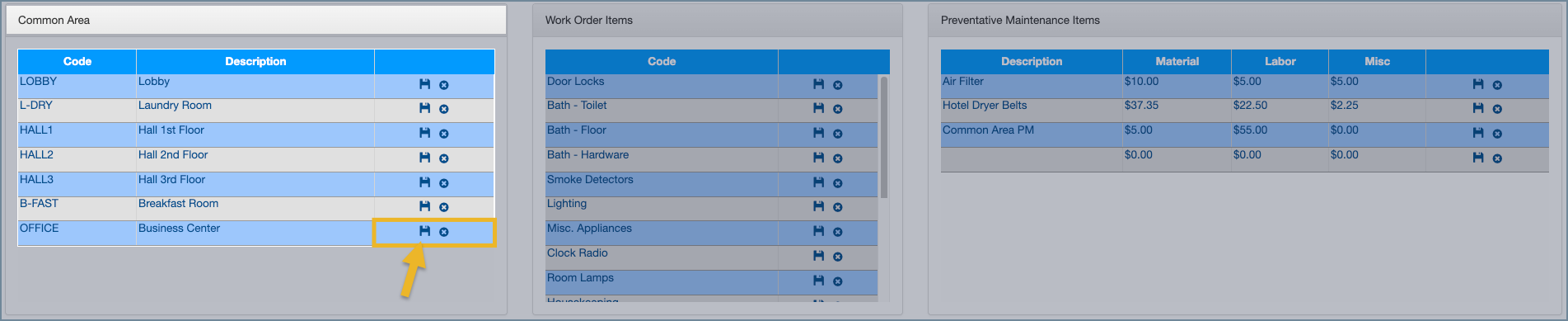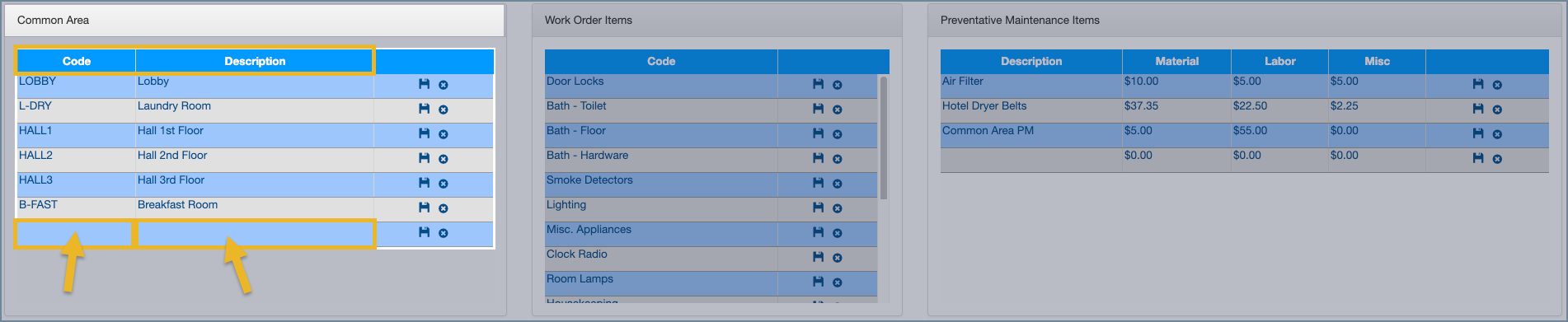 1. In the last empty row of the list, enter a Code (up to 6 characters) and a Description for the new common area location.